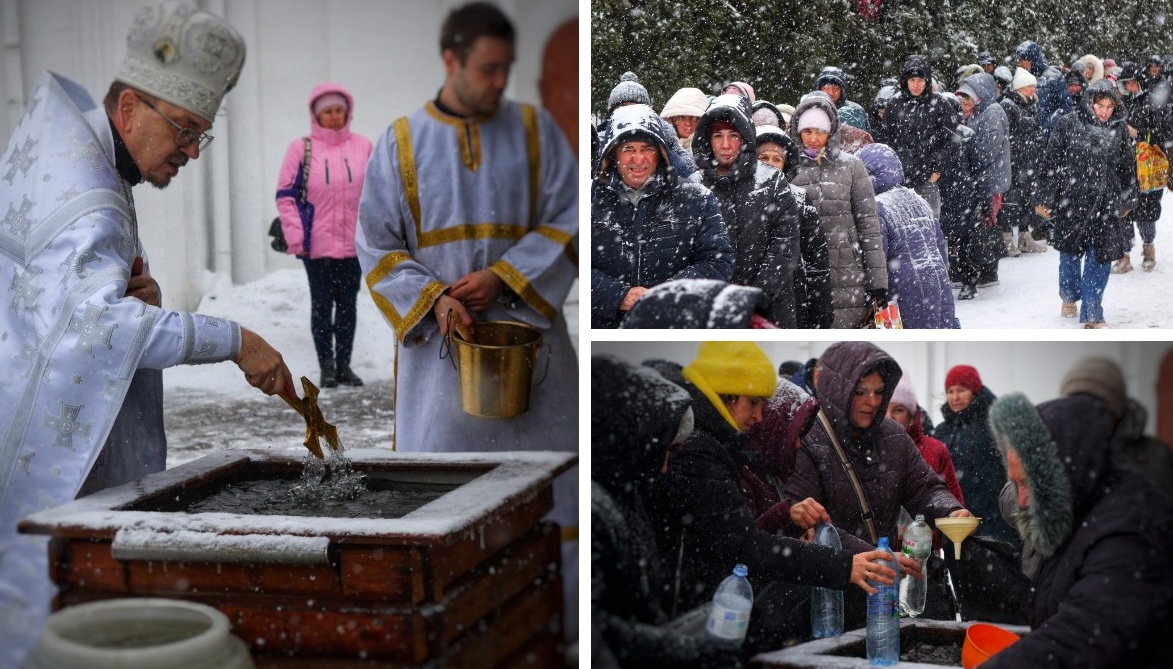 Але, дивлячись на вулицю, коли там сніг такий мете, я розумію, що ми краще сьогодні помолимося тут у церкві, а тоді я вийду і посвячу воду там на вулиці у приготовлених наших посудинах. Щоб не хворіли ми, щоб були здорові, а, попивши святої Йорданської води, у здоровʼї та радості наближали нашу перемогу і дочекалися наших воїнів з перемогою. І щоб Пасху ми святкували у вільній державі Україні і без війни, без тривог, а в радості духовній.